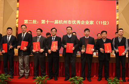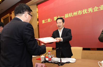 1月16日上午,市工业经济联合会、企业联合会、企业家协会举行2015年度会员大会。省委常委、市委书记赵一德出席会议并讲话,省“三会”会长张蔚文致辞,市领导许勤华、张耕出席。会议表彰了第十一届杭州市优秀企业家和2015年市企业管理现代化创新成果。图为:省委常委、市委书记赵一德给公司程磊楠董事长颁奖。