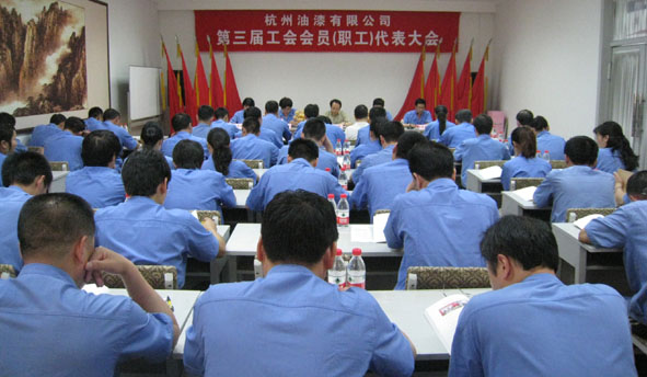 63午,杭州油漆有限公司公司工会三届会员(职工)代表大会在公司大楼楼会议室召开,杭州市工业工会主任张明同志应邀出席大会,工会副主席傅震红同志主持会议。