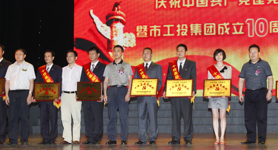 在杭州市工投集团成立10周年纪念会上,杭州油漆有限公司油漆党支部(左二)获得市工投集团创先争优“工业先锋·闪光言行”十佳基层党组织称号。